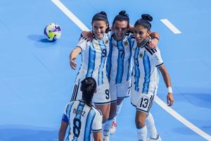 (251127) -- CIUDAD DE PASIG, 27 noviembre, 2025 (Xinhua) -- Jugadoras de Argentina festejan después de realizar una anotación durante el partido del grupo A entre Argentina y Filipinas en la Copa Mundial Femenina de Futsal de la FIFA 2025, en la Ciudad de Pasig, Filipinas, el 27 de noviembre de 2025. (Xinhua/Rouelle Umali) (rtg) (ra) (vf)