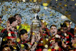 (251130) -- LIMA, 30 noviembre, 2025 (Xinhua) -- Imagen de 29 de noviembre de 2025 de jugadores de Flamengo festejando con la copa después de ganar el partido final de la Copa Libertadores, ante Palmeiras, celebrado en el estadio Monumental, en Lima, Perú. (Xinhua/Mariana Bazo) (mb) (rtg) (ah)