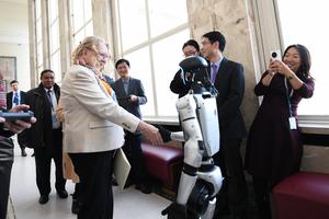 (251127) -- GINEBRA, 27 noviembre, 2025 (Xinhua) -- Imagen del 25 de noviembre de 2025 de Tatiana Valovaya (frente), directora general de la Oficina de las Naciones Unidas en Ginebra, estrechando la mano de un robot previo a un diálogo de alto nivel sobre gobernanza de la IA titulado "Diálogo de Ginebra: Solidaridad para la Gobernanza de la IA", en el Palacio de las Naciones, en Ginebra, Suiza. La Misión Permanente de China en Ginebra, junto con las misiones permanentes de Pakistán y Zambia, convocaron el martes a un diálogo de alto nivel sobre gobernanza de la IA titulado "Diálogo de Ginebra: Solidaridad para la Gobernanza de la IA" en el Palacio de las Naciones, sede de la Oficina de las Naciones Unidas en Ginebra. (Xinhua/Lian Yi) (jg) (ah) (vf)