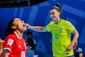 (251129) -- CIUDAD DE PASIG, 29 noviembre, 2025 (Xinhua) -- Lucileia (d), de Brasil, festeja después de realizar una anotación durante el partido del grupo D entre Panamá y Brasil en la Copa Mundial Femenina de Futsal de la FIFA 2025, en la Ciudad de Pasig, Filipinas, el 29 de noviembre de 2025. (Xinhua/Rouelle Umali) (rtg) (da)