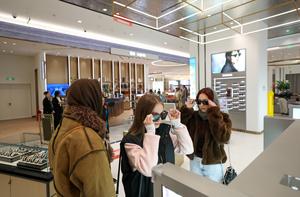 (251128) -- TIANJIN, 28 noviembre, 2025 (Xinhua) -- Clientes extranjeros se prueban gafas para el sol en una tienda libre...