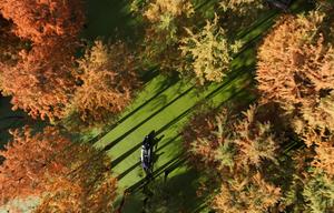 (251128) -- HANGZHOU, 28 noviembre, 2025 (Xinhua) -- Turistas reman a través de un bosque anegado en el punto escénico...