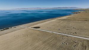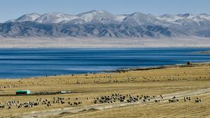 (251128) -- XINING, 28 noviembre, 2025 (Xinhua) -- Vista aérea tomada con un dron de un rebaño de ovejas en...