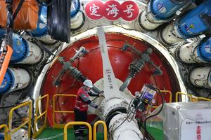 (251128) -- ZHOUSHAN, 28 noviembre, 2025 (Xinhua) -- Un técnico verifica el funcionamiento dentro de la tuneladora "Dinghai", en Zhoushan,...