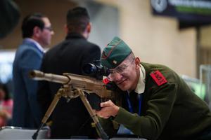 (251202) -- BOGOTA, 2 diciembre, 2025 (Xinhua) -- Imagen del 1 de diciembre de 2025 de un elemento de las Fuerzas Armadas colombianas probando armamento durante el primer día de Expodefensa 2025 en el recinto ferial Corferias, en Bogotá, capital de Colombia. Con la presencia del ministro de Defensa de Colombia, Pedro Sánchez, abrió sus puertas Expodefensa 2025, una feria internacional que reúne a empresas líderes del sector de la seguridad y la defensa a nivel mundial. La edición de este año cuenta con pabellones de 28 países en el gran salón del recinto ferial Corferias de Bogotá. (Xinhua/Andrés Moreno) (am) (jg) (ra) (vf)