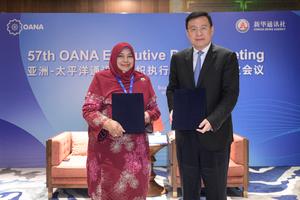 (251203) -- BOAO, 3 diciembre, 2025 (Xinhua) -- Fu Hua, presidente de la Agencia de Noticias Xinhua, y Nur-ul Afida...