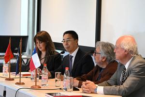 (251202) -- SANTIAGO, 2 diciembre, 2025 (Xinhua) -- El embajador de China en Chile, Niu Qingbao (2-i), pronuncia un discurso...