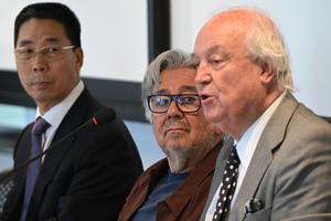(251202) -- SANTIAGO, 2 diciembre, 2025 (Xinhua) -- El fotógrafo chileno, Miguel Sayago (c), pronuncia un discurso durante la presentación de...