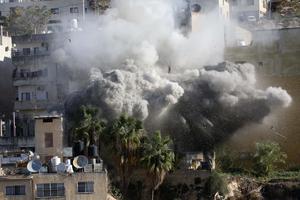 (251202) -- NAPLUSA, 2 diciembre, 2025 (Xinhua) -- Humo se eleva mientras las fuerzas israelíes hacen explotar una vivienda palestina,...