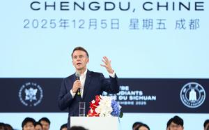 (251205) -- CHENGDU, 5 diciembre, 2025 (Xinhua) -- El presidente francés, Emmanuel Macron, visita la Universidad de Sichuan, en Chengdu, en la provincia de Sichuan, en el suroeste de China, el 5 de diciembre de 2025. (Xinhua/Liu Yuchen) (jg) (da) (vf)