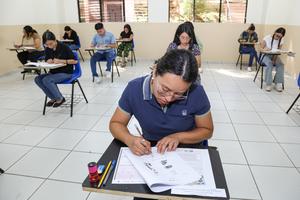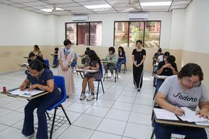 (251206) -- SAN SALVADOR, 6 diciembre, 2025 (Xinhua) -- Alumnos realizan las primeras pruebas de certificación del idioma chino mandarín...