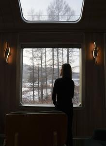 (251206) -- HARBIN, 6 diciembre, 2025 (Xinhua) -- Una pasajera disfruta de la vista invernal en un vagón de un...