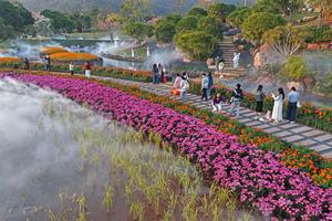 (251212) -- BEIJING, 12 diciembre, 2025 (Xinhua) -- Imagen tomada con un dron el 26 de noviembre de 2025 de turistas observando las flores en el área escénica de la montaña Qingxiu, en Nanning, en la región autónoma de la etnia zhuang de Guangxi, en el sur de China. (Xinhua/Zhou Hua) (jg) (da) (vf)