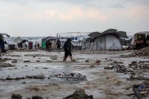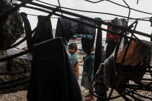 (251212) -- GAZA, 12 diciembre, 2025 (Xinhua) -- Niños palestinos salen de sus refugios temporales tras la lluvia, en la...