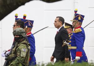 (251212) -- QUITO, 12 diciembre, 2025 (Xinhua) -- El presidente peruano, José Jerí (c), participa en la colocación de una...
