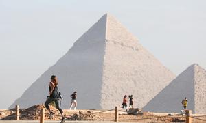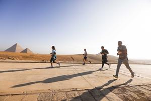(251213) -- GIZA, 13 diciembre, 2025 (Xinhua) -- Corredores participan en el Medio Maratón de las Pirámides celebrado en el...