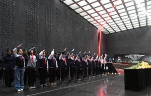 (251213) -- BEIJING, 13 diciembre, 2025 (Xinhua) -- Personas rinden tributo a los mártires en una plaza de un salón...