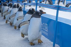(251213) -- HARBIN, 13 diciembre, 2025 (Xinhua) -- Pingüinos son vistos durante un evento de desfile de pingüinos en Harbin...