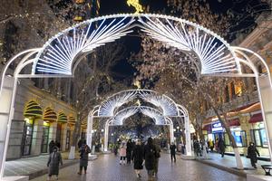 (251216) -- HARBIN, 16 diciembre, 2025 (Xinhua) -- Decoraciones luminosas son vistas en la Calle Central, en Harbin, capital de...
