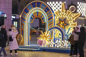 (251216) -- HARBIN, 16 diciembre, 2025 (Xinhua) -- Turistas toman fotografías de una instalación en la Calle Central, en Harbin,...
