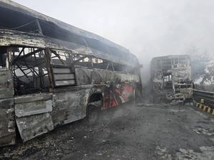 (251216) -- MATHURA, 16 diciembre, 2025 (Xinhua) -- Restos de autobuses son vistos después de una colisión múltiple de vehículos...