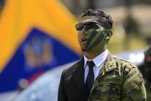 (251216) -- QUITO, 16 diciembre, 2025 (Xinhua) -- Un miembro del Ejército ecuatoriano participa durante la ceremonia de entrega de...