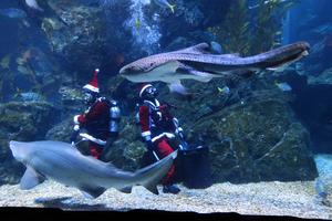 (251218) -- BANGKOK, 18 diciembre, 2025 (Xinhua) -- Buzos vestidos con trajes de Santa Claus realizan una presentación en el...