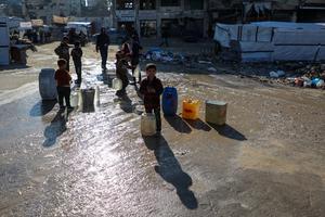 (251218) -- CIUDAD DE GAZA, 18 diciembre, 2025 (Xinhua) -- Niños palestinos recolectan agua de un camión, en la Ciudad...