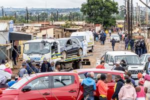 (251221) -- JOHANNESBURGO, 21 diciembre, 2025 (Xinhua) -- Personas son vistas en el sitio de un tiroteo, en Bekkersdal, Sudáfrica,...