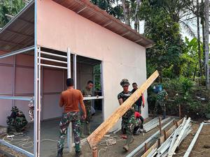 (251220) -- YAKARTA, 20 diciembre, 2025 (Xinhua) -- Soldados del Ejército indonesio construyen una vivienda para las víctimas de las...