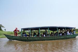 (251223) -- GANVIE, 23 diciembre, 2025 (Xinhua) -- Niños participan en un evento con temática de Navidad llevado a cabo...