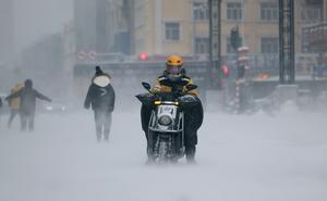 (251223) -- HARBIN, 23 diciembre, 2025 (Xinhua) -- Un repartidor trabaja bajo la nevada, en Harbin, en la provincia de...
