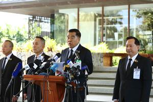 (251227) -- CHANTHABURI, 27 diciembre, 2025 (Xinhua) -- El ministro de Defensa tailandés, Natthapon Nakpanich (c), habla durante una conferencia...