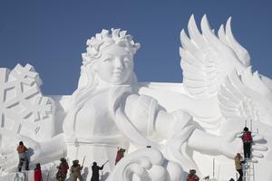 (251227) -- HARBIN, 27 diciembre, 2025 (Xinhua) -- Artesanos trabajan en una escultura de nieve en la 38 Exposición Internacional...