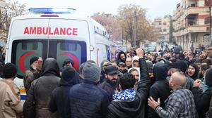 (251227) -- HOMS, 27 diciembre, 2025 (Xinhua) -- Dolientes se reúnen afuera de la mezquita Imam Ali bin Abi Talib...