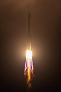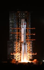 (251130) -- WENCHANG, 30 noviembre, 2025 (Xinhua) -- Un cohete portador Gran Marcha-7 modificado transportando el satélite Shijian-28 despega desde...