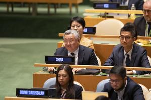 (251212) -- NACIONES UNIDAS, 12 diciembre, 2025 (Xinhua) -- Fu Cong (i-c), representante permanente de China ante la ONU, presenta...