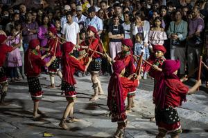 (250907) -- KATMANDU, 7 septiembre, 2025 (Xinhua) -- Imagen del 6 de septiembre de 2025 de bailarines enmascarados realizando una...