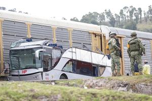 (250908) -- ATLACOMULCO, 8 septiembre, 2025 (Xinhua) -- Soldados vigilan en el sitio de un accidente, en Atlacomulco, México, el...
