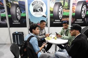 (250908) -- SANTIAGO, 8 septiembre, 2025 (Xinhua) -- Personas visitan el estand de una marca china de llantas durante la...