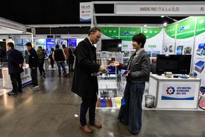 (250908) -- SANTIAGO, 8 septiembre, 2025 (Xinhua) -- Un visitante conversa con una expositora de una compañía china durante la...