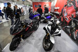 (250908) -- SANTIAGO, 8 septiembre, 2025 (Xinhua) -- Personas visitan el estand de una marca china de motocicletas durante la...