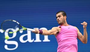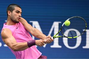 (250906) -- NUEVA YORK, 6 septiembre, 2025 (Xinhua) -- Imagen del 5 de septiembre de 2025 de Carlos Alcaraz devolviendo...