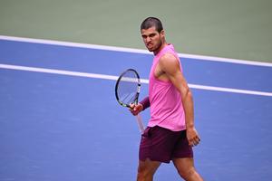 (250906) -- NUEVA YORK, 6 septiembre, 2025 (Xinhua) -- Imagen del 5 de septiembre de 2025 de Carlos Alcaraz festejando...