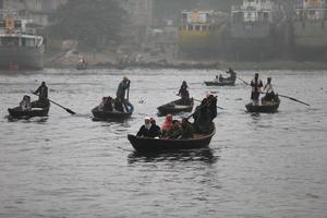 (251229) -- DHAKA, 29 diciembre, 2025 (Xinhua) -- Barcos transportan pasajeros a través del Río Buriganga en medio de la...