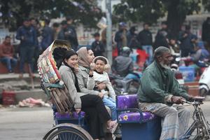 (251229) -- DHAKA, 29 diciembre, 2025 (Xinhua) -- Niñas vestidas con ropa de invierno transitan en un rickshaw en un...