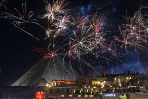 (260101) -- GIZA, 1 enero, 2026 (Xinhua) -- Fuegos artificiales explotan cerca de las Pirámides de Giza en celebración del...