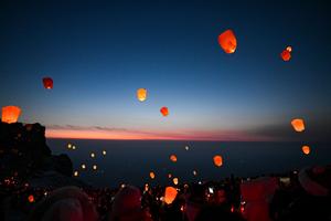 (260101) -- BEIJING, 1 enero, 2026 (Xinhua) -- Personas liberan linternas Kongming electrónicas al amanecer en un área escénica de...