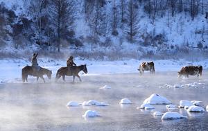 (260101) -- ARXAN, 1 enero, 2026 (Xinhua) -- Turistas montan caballos a través del río Halha, en la ciudad de...