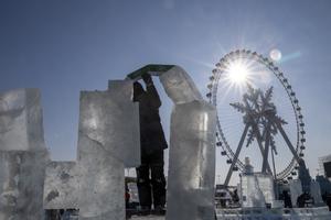 (260102) -- HARBIN, 2 enero, 2026 (Xinhua) -- Un competidor trabaja en una escultura de hielo durante el 37 Concurso...